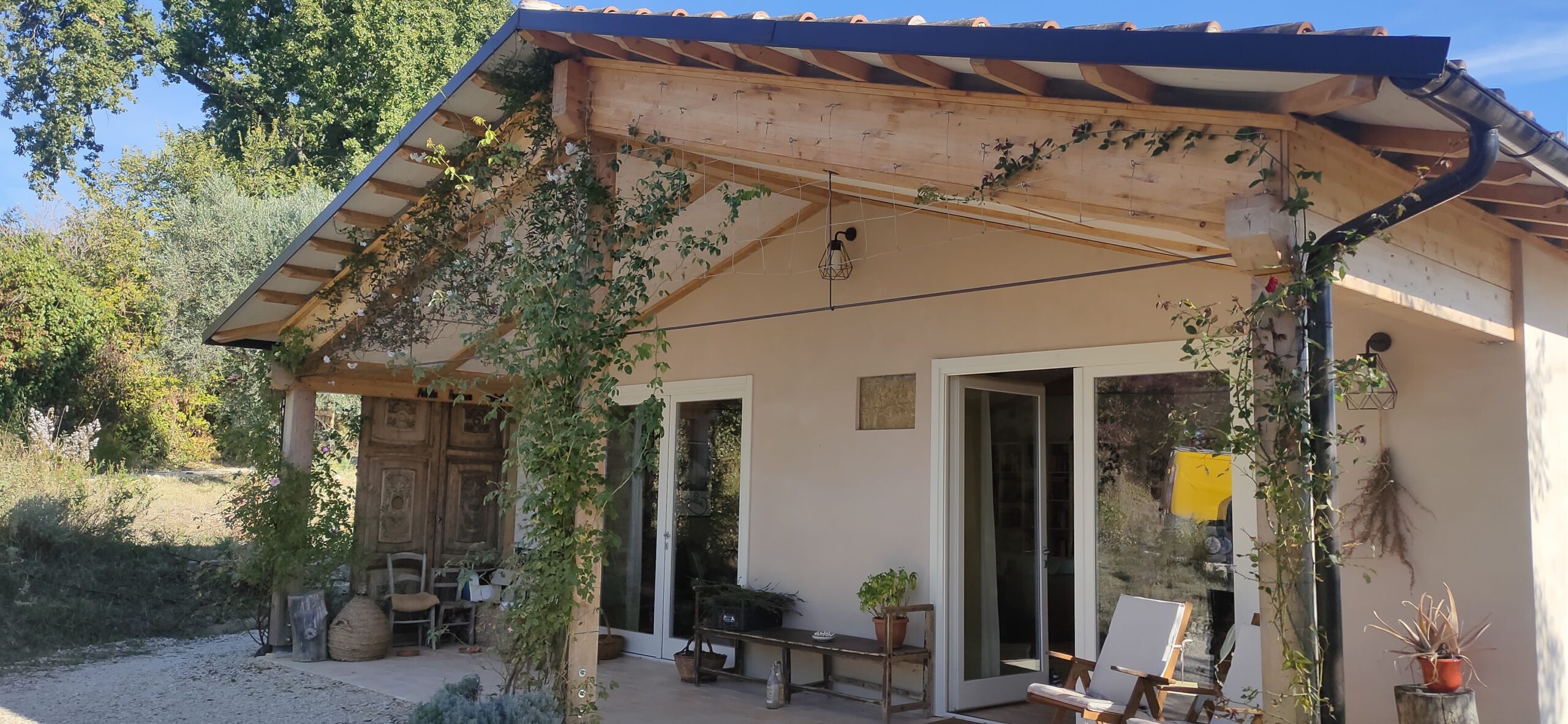 Il pergolato genera un ambiente coperto esterno oltre a filtrare la luce diretta nella zona giorno.