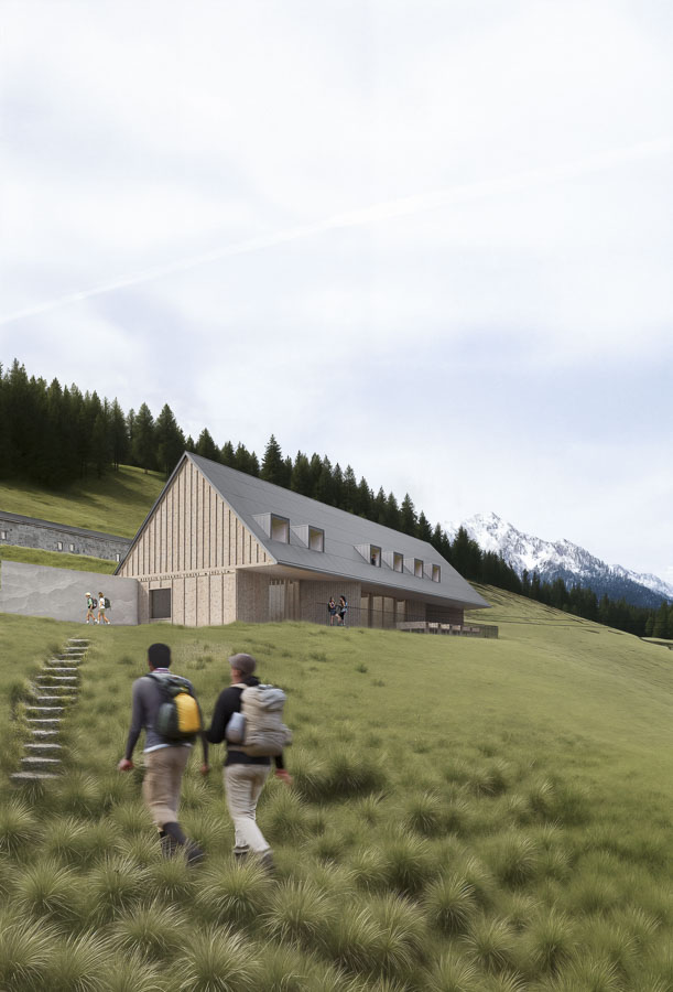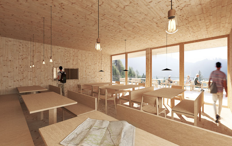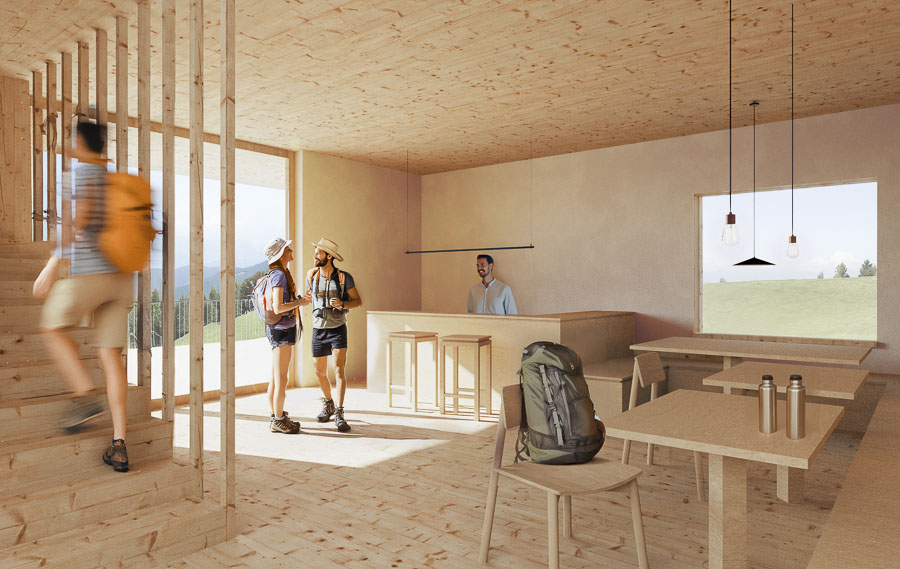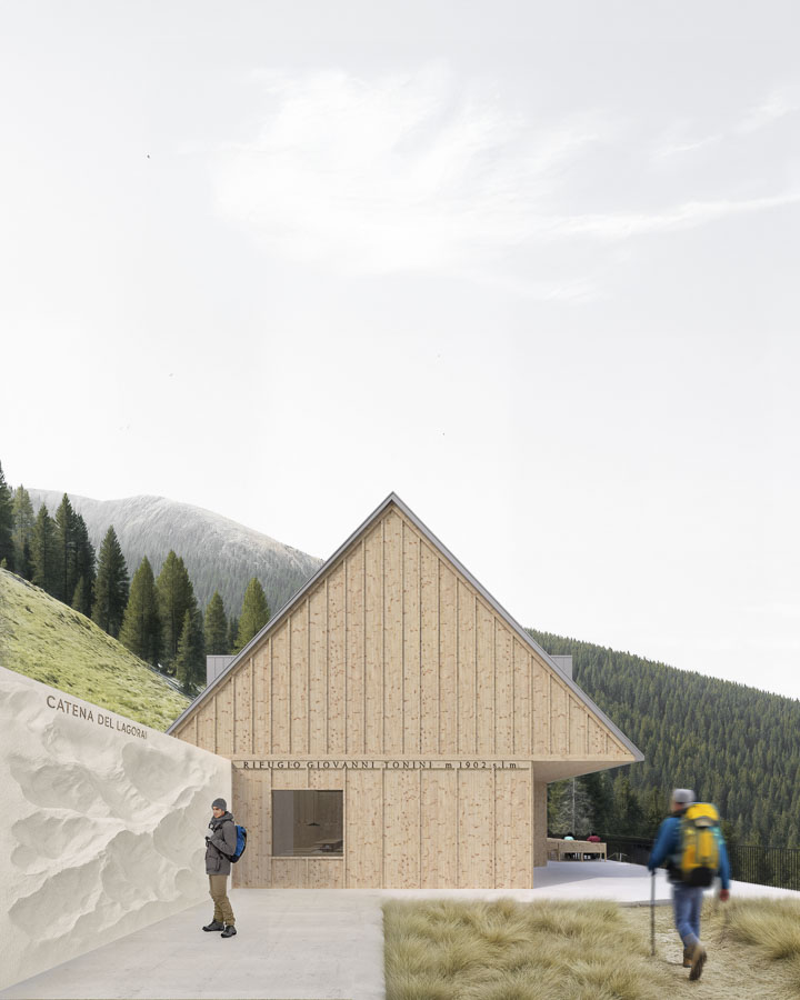 Il progetto si fonda su una logica costruttiva ibrida, capace di garantire durabilità, precisione esecutiva e compatibilità con la logistica in quota. Il piano terra è realizzato con una struttura a telaio in legno lamellare, che assicura resistenza meccanica e versatilità. Il piano primo adotta un sistema in pannelli portanti in X-Lam, più leggero e adatto alla prefabbricazione.