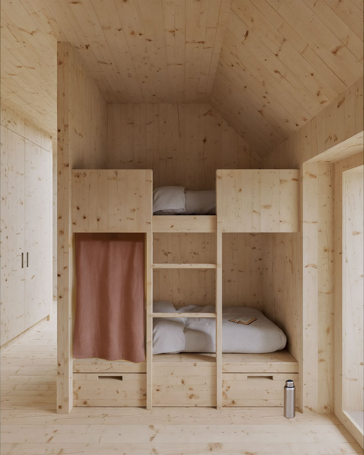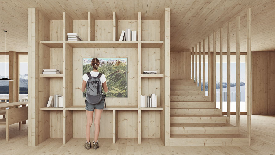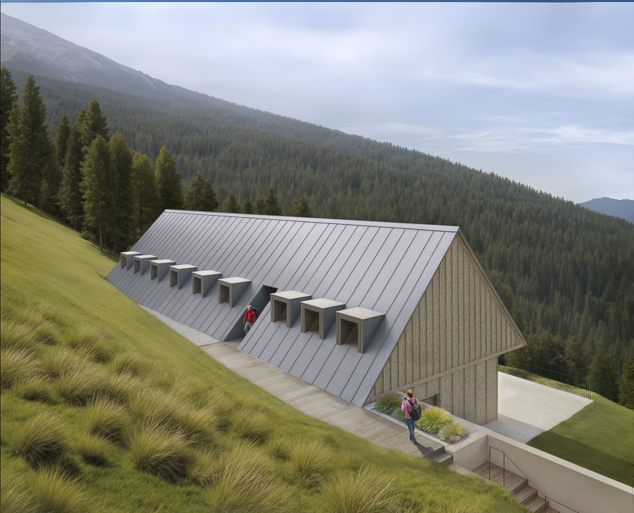Il tamponamento dell’intero edificio è costituito da moduli prefabbricati in paglia, realizzati in ambiente controllato, formati da una struttura lignea con riempimento in paglia compressa e rivestimenti traspiranti naturali, come l’intonaco in argilla. Questi moduli sono progettati per un montaggio rapido, a secco e senza macchinari pesanti. La cantierizzazione tiene conto dell’assenza di accesso carrabile, come previsto dal bando. L’approvvigionamento dei materiali avverrà esclusivamente tramite elicottero e/o teleferica temporanea. In questo scenario, l’impiego di componenti modulari leggeri consente di: